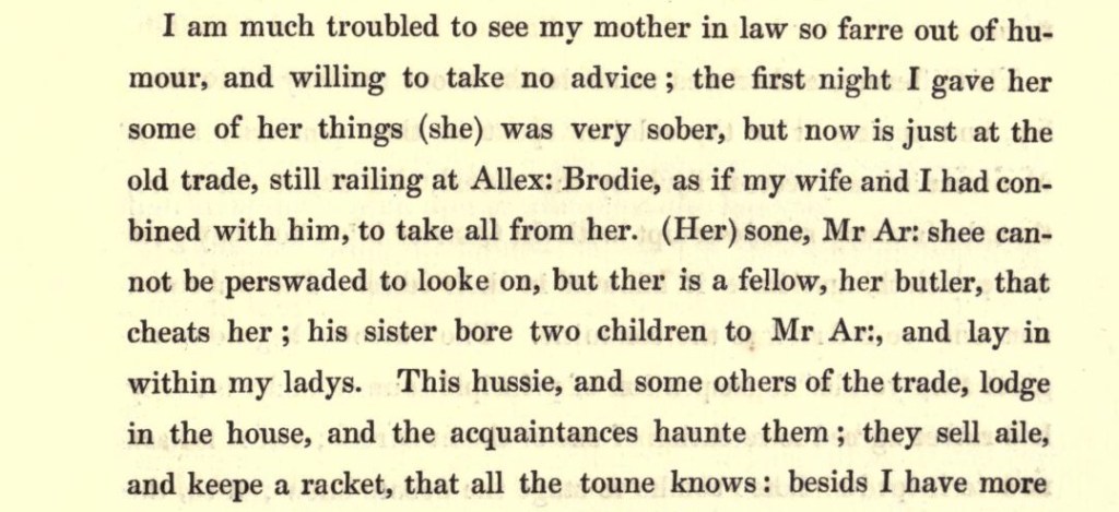 Brodie may have enlisted the support of Alexander Stuart at this point. Relations thereafter may have continued to be distant, and subsequently Countess Margaret strongly objected to a scheme or settlement in favour of her son that would convert her landed income to a salary. She drafted a passionate prayer and declaration denouncing Brodie and her son to present to an advocate, Alexander Falconer of Halkerton.