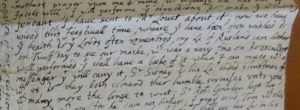 “… I will performe your directions, & make you [Grace] a dainty pendant, I have sent to Mr [Drew] Louet about it; now we have ended this Feastivall time, wheare you have been often wished and your health & your lords often remembered, my lo: of Rutland came hither on Twelf day to see our maske which was a very fine on & excellent well performed, you shall have a booke of it when I can meete with a messenger that will carry it, Sr Sidney & his la: ended christmas with us, & they both comend ther humble sirvises unto you, with many more the longe to writ; Sr Robert Gourdon kept not his promis with you for he cam not hither, …”1