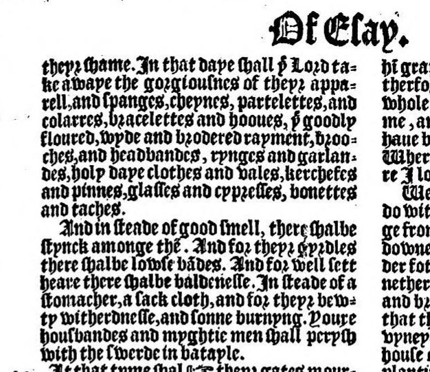 And in steade of good smell, there shalbe stynck amonge them. And for theyr gyrdles there shalbe lowse bandes. And for well sett heare there shalbe baldnesse. In steade of a stomacher, a sack cloth, and for theyr bewty witherdnesse, and sonne burnyng.”3