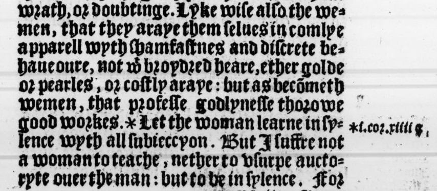 - The booke of the prophete Esay, The Byble in Englyshe (Edward Whytchurche, 1540), fol. xlii-xliii. ‘Hooues’ or howes were hoods or coifs: In the same letter Knox refers to the commands of the apostles Peter and Paul on women’s apparel, presumably including 1 Timothy 2:9-10, ‘Lykewise also the wemen, that they araye themselves in comlye apparrell with shamfastnes and discrete behaveoure, not with broydered heare, eyther golde or pearles, or costly araye: but as becometh wemen, that professe godlynesse thorowe good workes.’, The Byble in Englyshe (Edward Whytchurche, 1540), fol. lxxxiii. ↩︎