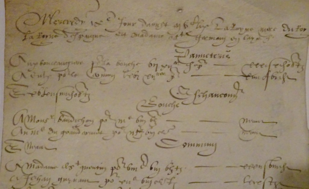 Payments for food for the household of Catherine De’ Medici were recorded daily, on long narrow strips of parchment. Usually the strips were signed by her Italian master of household J-B Seghiro or Seghizo (or even Seghiso). From Modena, he died in 1571 and was buried in Saint-Germain l’Auxerrois, Paris.1